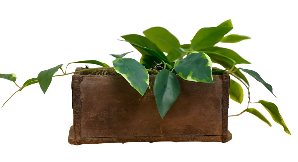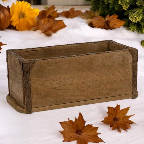 The distressed wood and rusted metal border exudes a vintage charm and adds character to any style space. Perfect for small plants, flowers or a place to store keys and mail.
