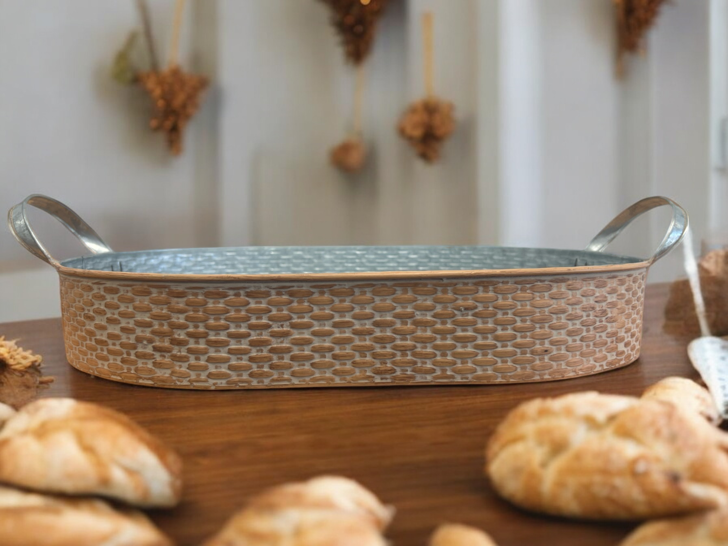 The Basket Weave Embossed Tray is made of metal with a golden-brown finish. The oval tray has rounded handles and a galvanized interior. This tray is perfect for decorating for the holidays.