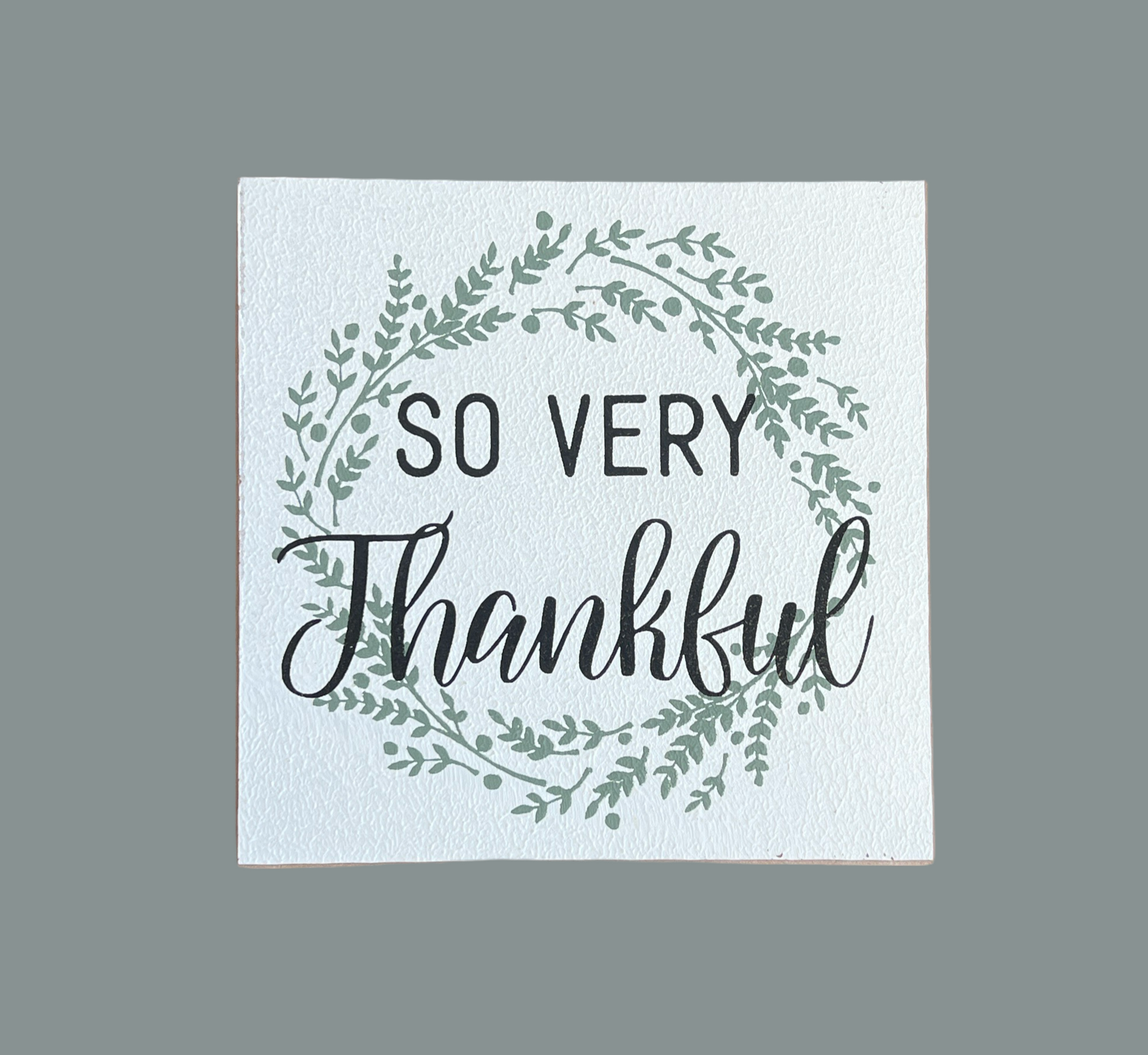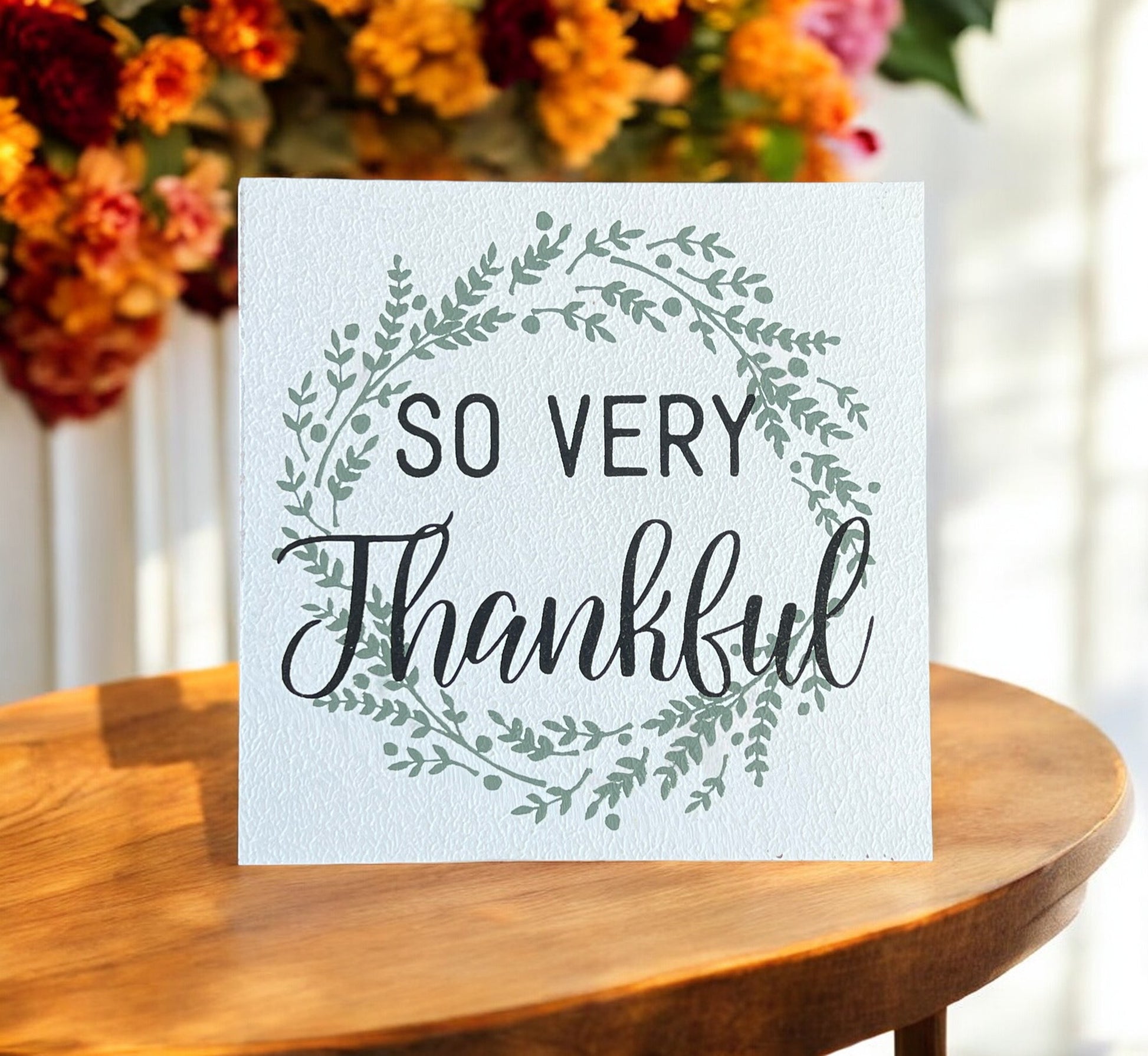 "So Very Thankful" wood decoration. Perfect for hanging on a wall or displaying on a bookshelf. Beautiful wreath design.